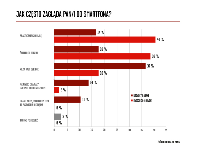 The results of the study conducted by Deutsche Bank among smartphone and tablet owners indicate that people aged 18 to 24 are significantly more likely to use the former devices, checking them almost every moment (as many as 41% of respondents) or at most once an hour (39% of those surveyed). However, when comparing the respondents' answers without age group division, the largest group – 37% of respondents – uses a smartphone only a few times a day. Therefore, it can be safely stated that it is young people who have learned to fully utilize the functionality of these modern phones; they cannot and simply do not want to live without them anymore.