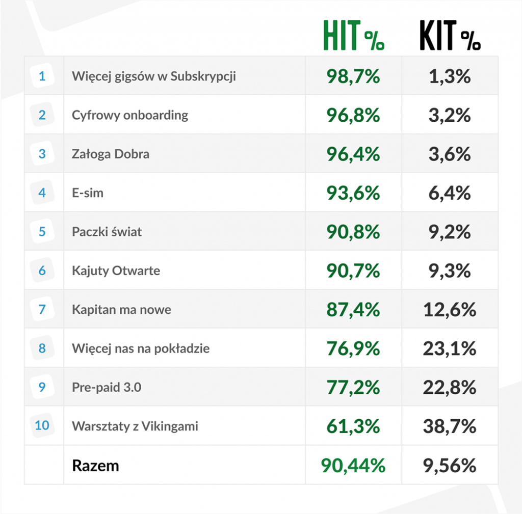 The real hit turned out to be a larger number of gigs in the Subscription, which was rated positively by 98.7% of you. In second and third place, respectively, were: digital onboarding (96.8%) and Crew of Good (96.4%). At the other end of the spectrum were workshops with Vikings, but still with a very solid result of 61.3% positive responses. There would probably be more if all of you had made it… So, see you next time?