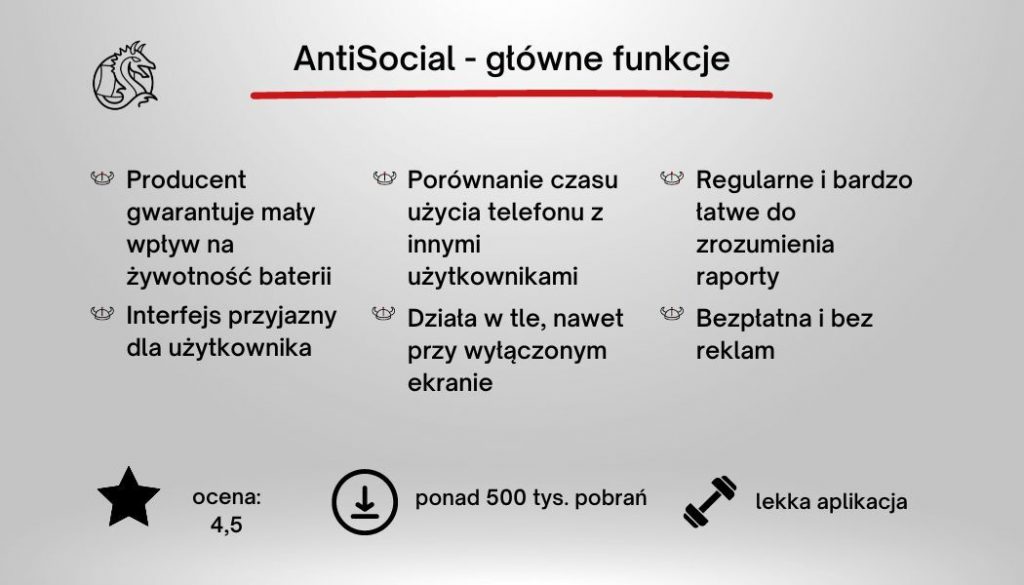- The manufacturer emphasizes that they have taken care of the app's technical aspects. AntiSocial has a very low impact on battery life, which is confirmed by many users.