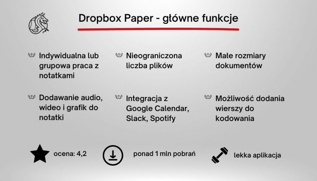 Warto podkreślić dużą wagę integracji z Google Calendar, Slack czy nawet Spotify. Dropbox Paper skupia się na współpracy zespołów oraz dzieleniu się efektami pracy i uwagami.