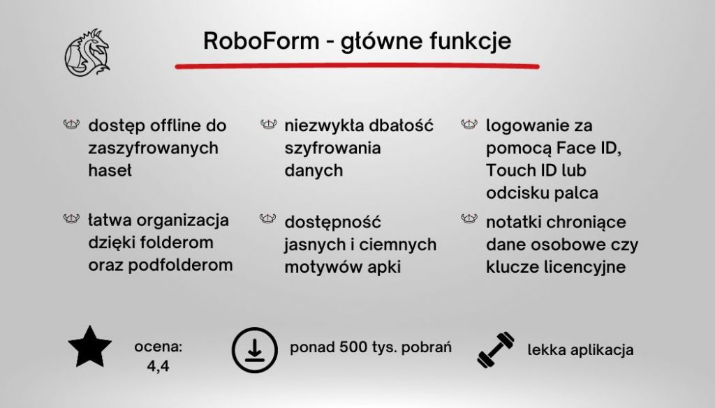 Tę aplikację do haseł wyróżnia przede wszystkim rozbudowana funkcjonalność oraz dbałość o bezpieczeństwo danych. 🤩 Twórcy RoboForm podkreślają, że nie przechowują nigdzie informacji na temat głównego hasła. Znasz je tylko Ty, co znacznie zmniejsza ryzyko wycieku jakichkolwiek danych. 🥳 Aplikację do zapamiętywania haseł odblokujesz za pomocą Touch ID, kodu PIN lub uwierzytelnienia dwuskładnikowego.