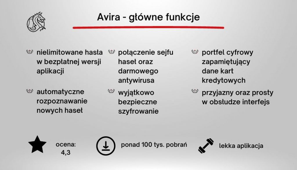 Ten bezpieczny menedżer haseł jest doceniany za prosty i przyjazny interfejs. 🤝 Na uwagę zasługuje połączenie funkcjonalności sejfu oraz darmowego antywirusa. Ciekawą opcją jest także portfel cyfrowy, który przechowa dla Ciebie dane kart kredytowych. Dodanie ich do apki jest bardzo szybkie, bo zeskanujesz je swoim aparatem w smartfonie. 📱 Opcja nielimitowanych haseł w bezpłatnej wersji to kolejna zaleta Aviry.