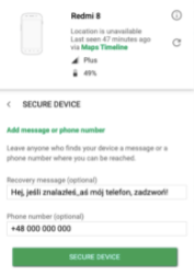 - Zabezpiecz telefon (secure my device) — ta opcja pozwoli ci wysłać wiadomość na ekran blokady telefonu np. z numerem, na który znalazca powinien zadzwonić (zobacz obrazek 1). Dzięki niej możesz też ustawić hasło/kod PIN na zgubionym telefonie — to koło ratunkowe dla tych, którzy nie mieli go wcześniej ustawionego.
