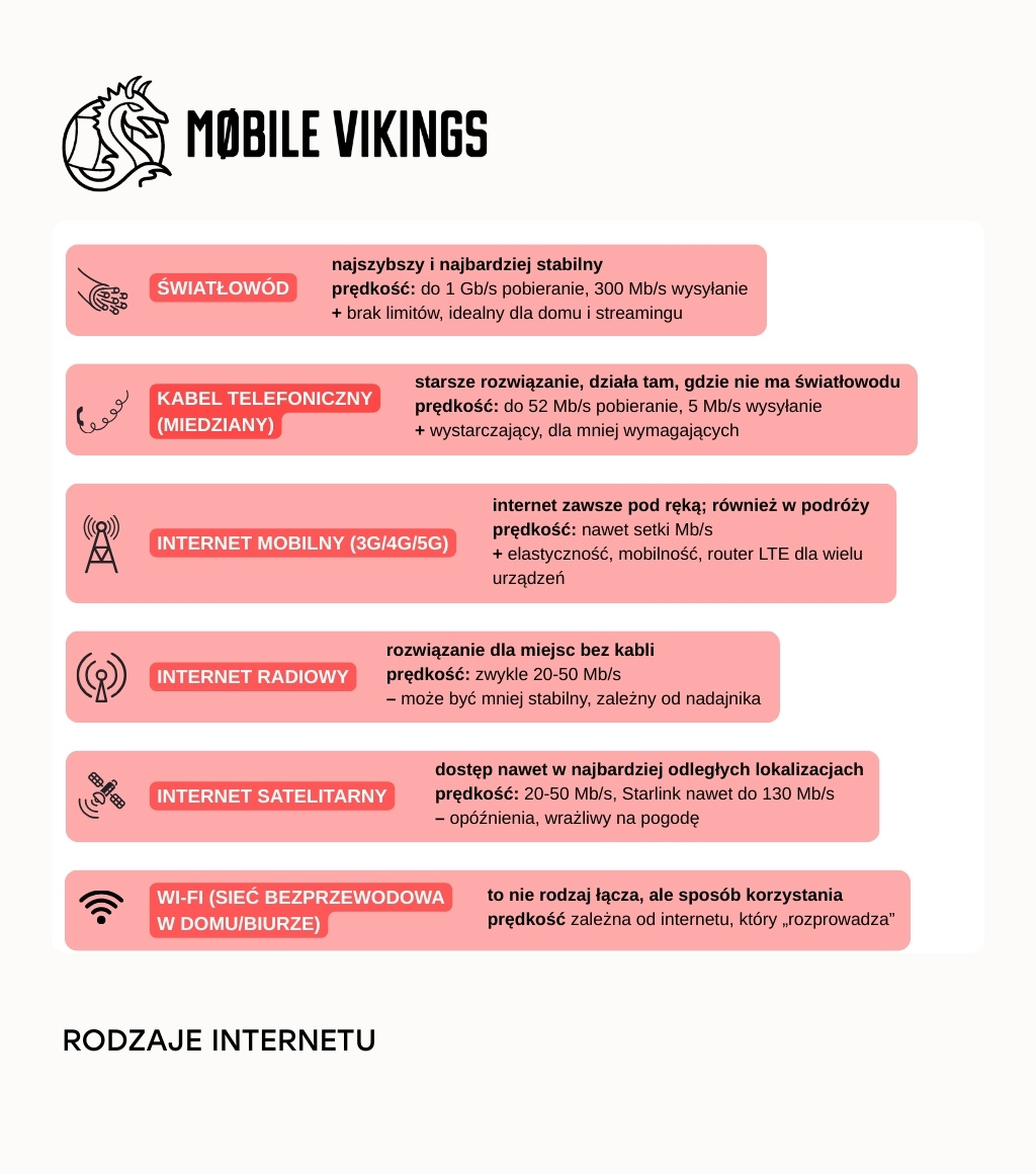 - Internet dzieli się na dwie główne kategorie: przewodowy (światłowód, kabel miedziany) oraz bezprzewodowy (Wi-Fi, internet mobilny, radiowy i satelitarny).
